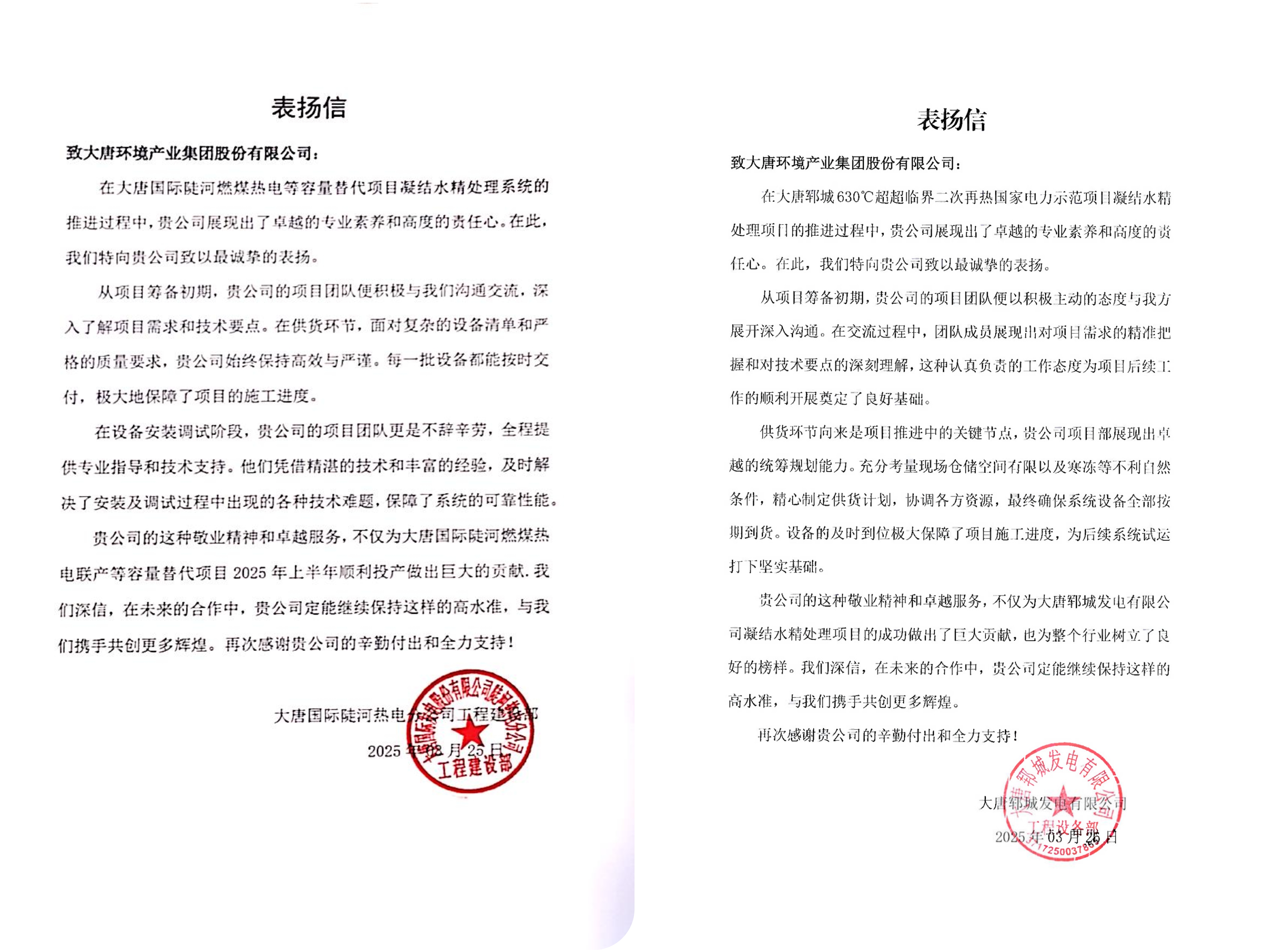 本網(wǎng)訊?近日,水處理事業(yè)部憑借在陡河項(xiàng)目與鄆城項(xiàng)目中的卓越表現(xiàn),接連收到兩封業(yè)主發(fā)來(lái)的表?yè)P(yáng)信。信中對(duì)我方團(tuán)隊(duì)展現(xiàn)出的專業(yè)實(shí)力、服務(wù)精神及執(zhí)行效率給予高度評(píng)價(jià)。?