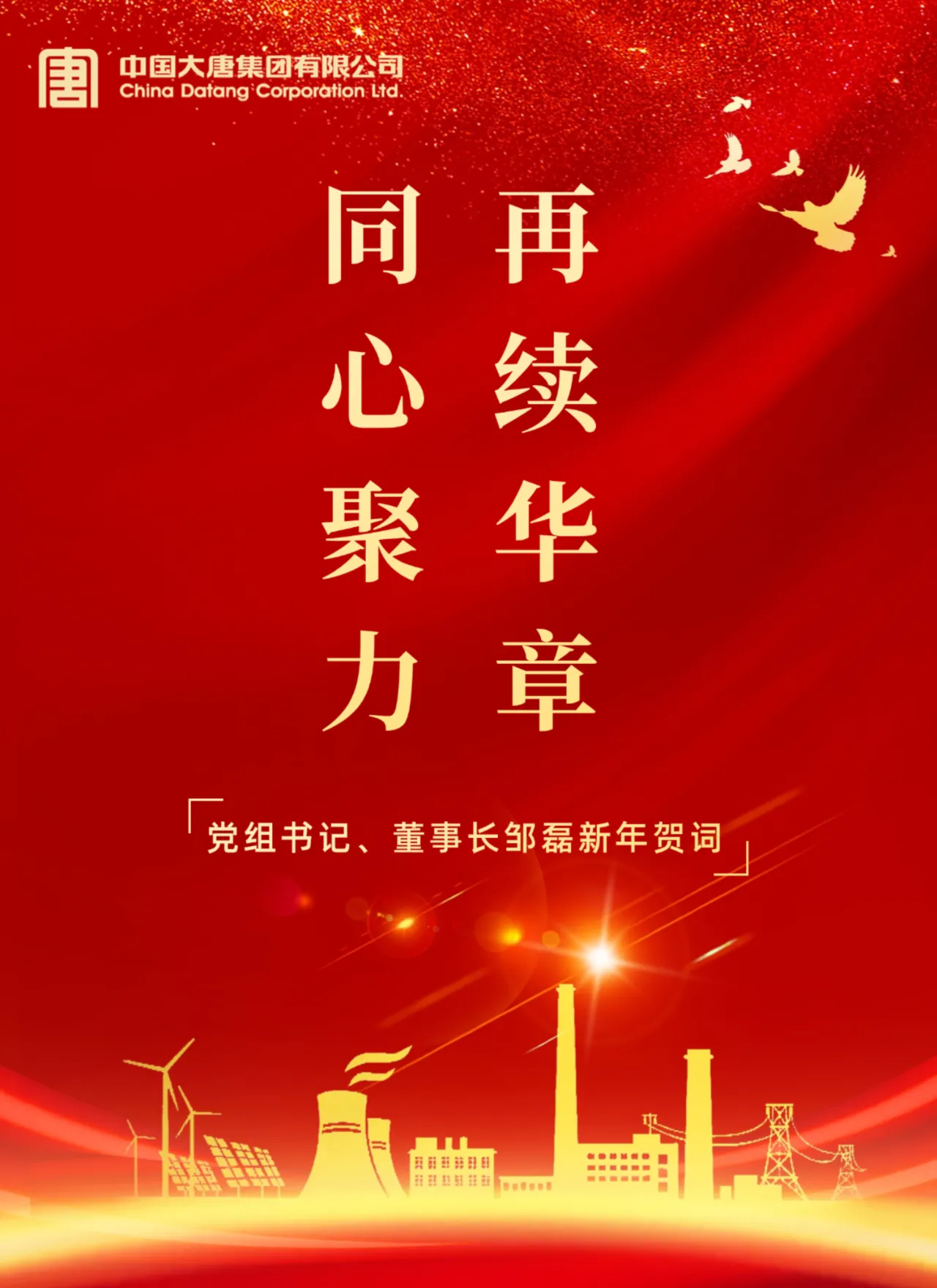 值此辭舊迎新之際,謹向長期以來關心支持中國大唐集團有限公司工作的各級領導、各界朋友、合作伙伴,向始終心系集團公司改革發(fā)展的離退休老領導、老同志,向奮戰(zhàn)在各條戰(zhàn)線的廣大干部職工和家屬,致以誠摯的問候和美好的祝愿!