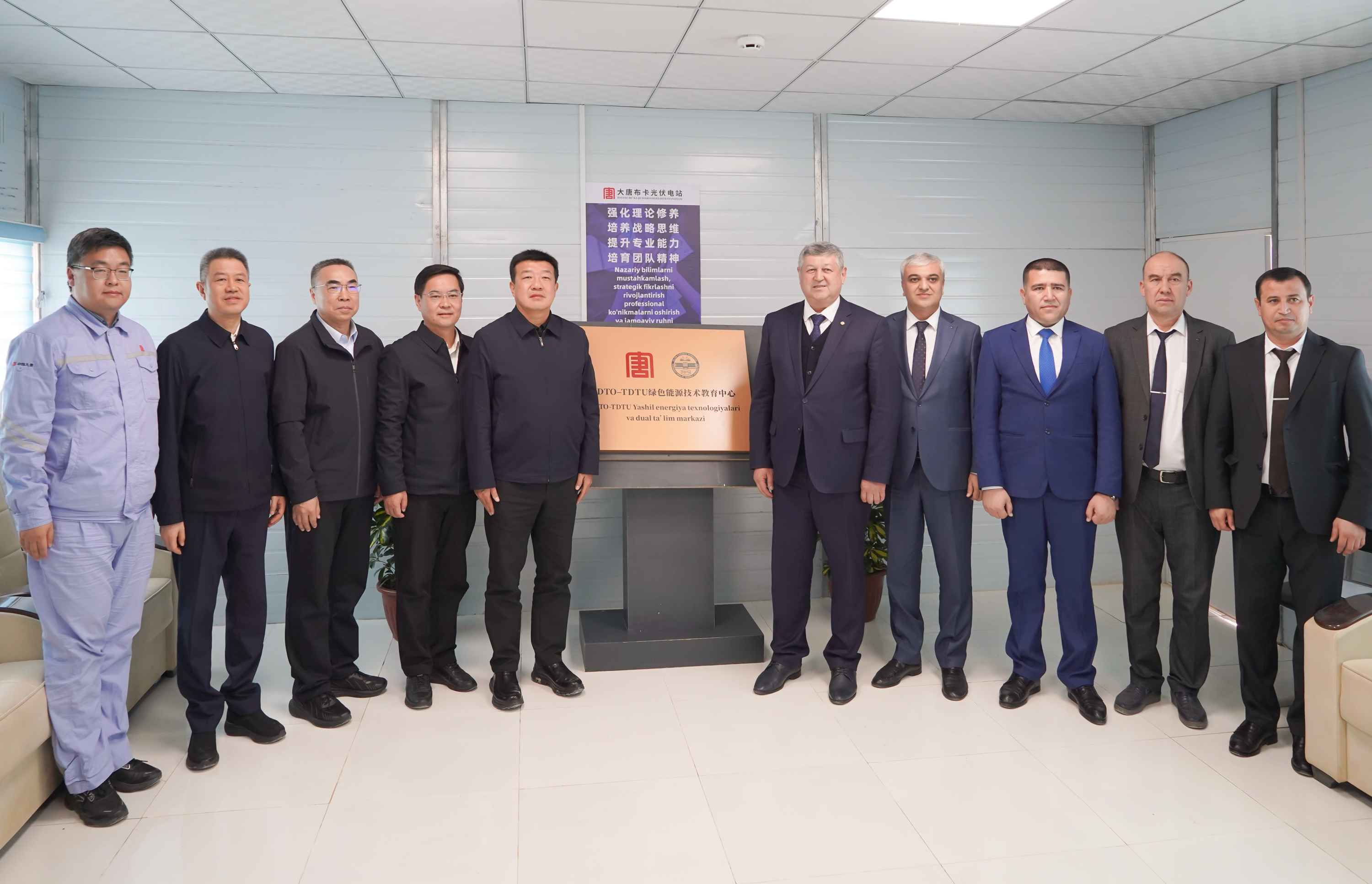 調(diào)研期間,呂軍在布卡光伏項目現(xiàn)場,與塔什干國立技術(shù)大學(xué)校長、院士薩德里丁·馬哈馬托維奇舉行會談,并共同為“大唐海投-塔什干國立技術(shù)大學(xué)綠色能源技術(shù)教育中心”揭牌。該技術(shù)教育中心后續(xù)將為塔什干國立技術(shù)大學(xué)畢業(yè)生提供實習(xí)實訓(xùn)機(jī)會,助力烏茲能源電力人才培養(yǎng)。