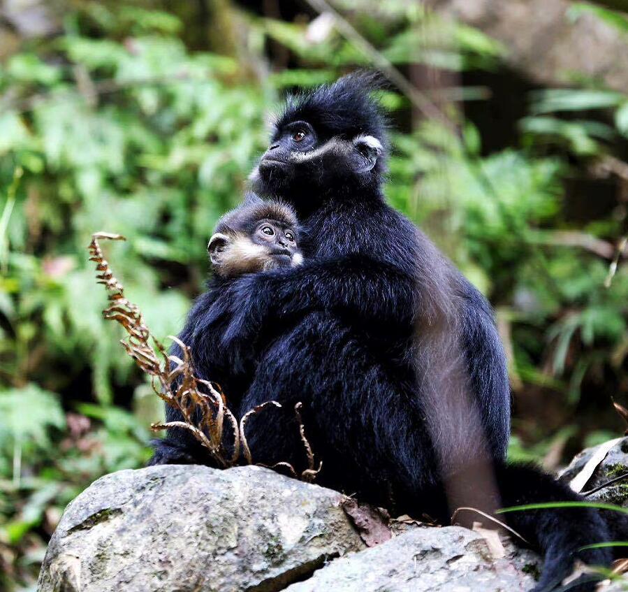 經(jīng)過長途奔波,快艇行駛到貴州省沿河縣境內(nèi)的“麻陽河國家級(jí)自然保護(hù)區(qū)”。山上傳來各種表達(dá)不同“情緒”的叫聲,在生態(tài)環(huán)保專業(yè)崗位奮斗8年之久的饒振祺朝密林中一指:“快看,那就是黑葉猴!發(fā)出‘嘎,嘎’的叫聲,說明它們處在愉快的覓食狀態(tài)中;‘噢、噢’就是它們?cè)谏搅珠g攀援前進(jìn)的信號(hào)?!碧а弁?,巖石間、樹蔭深處不斷有黑葉猴迅捷地跳躍。它們頭頂冠毛蓬松,通體黑色,兩頰雪白的“絡(luò)腮胡”格外醒目,看起來像銀須飄飄的“小老頭”。有的黑葉猴懷里還抱著“金寶寶”——幼猴毛色金黃,隨年齡增大變黑。